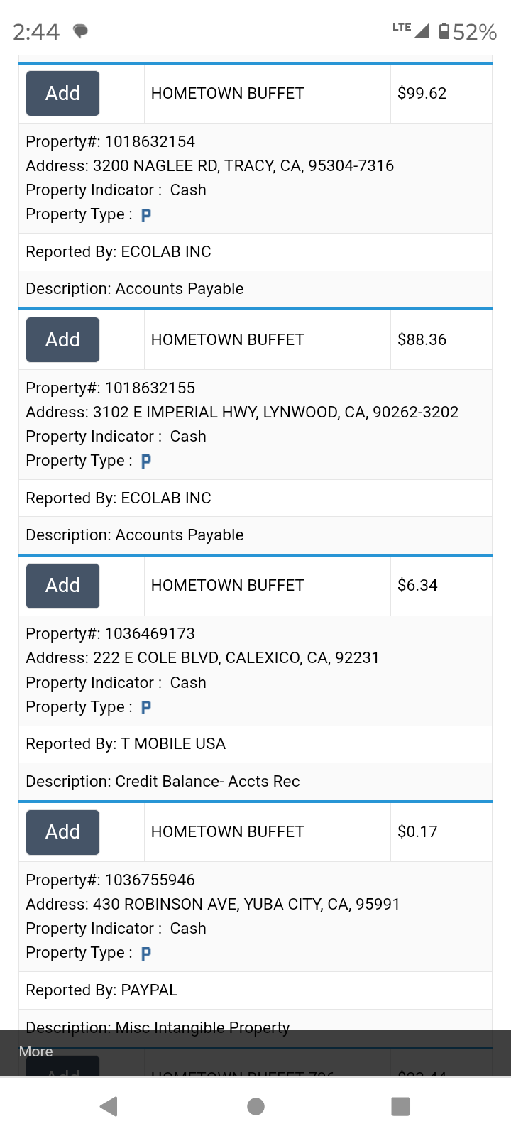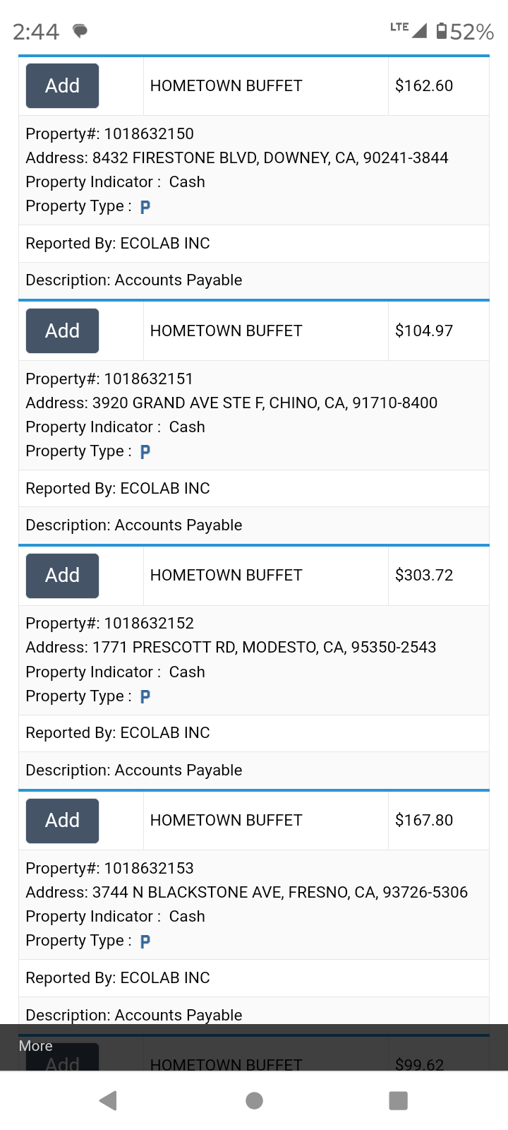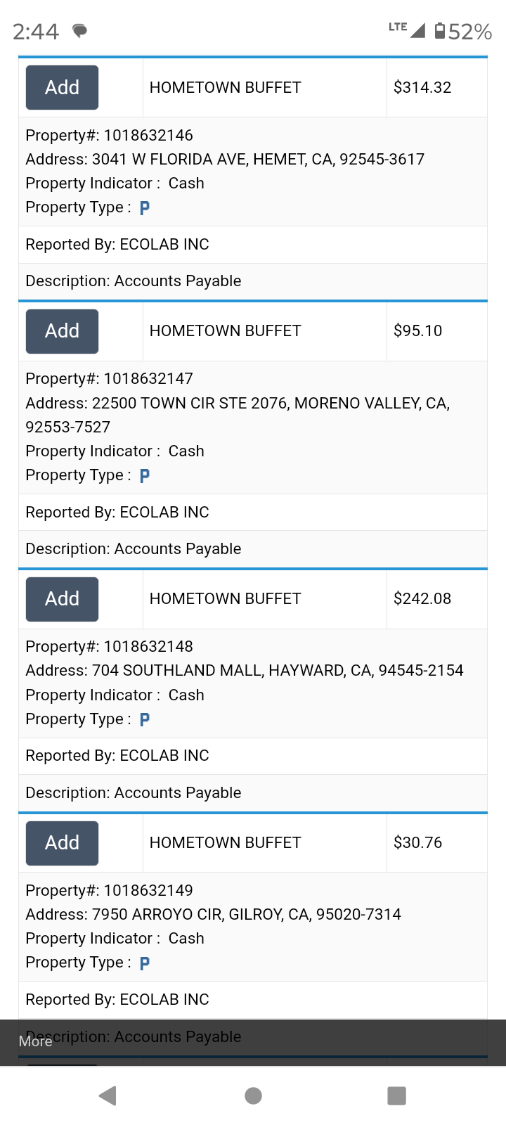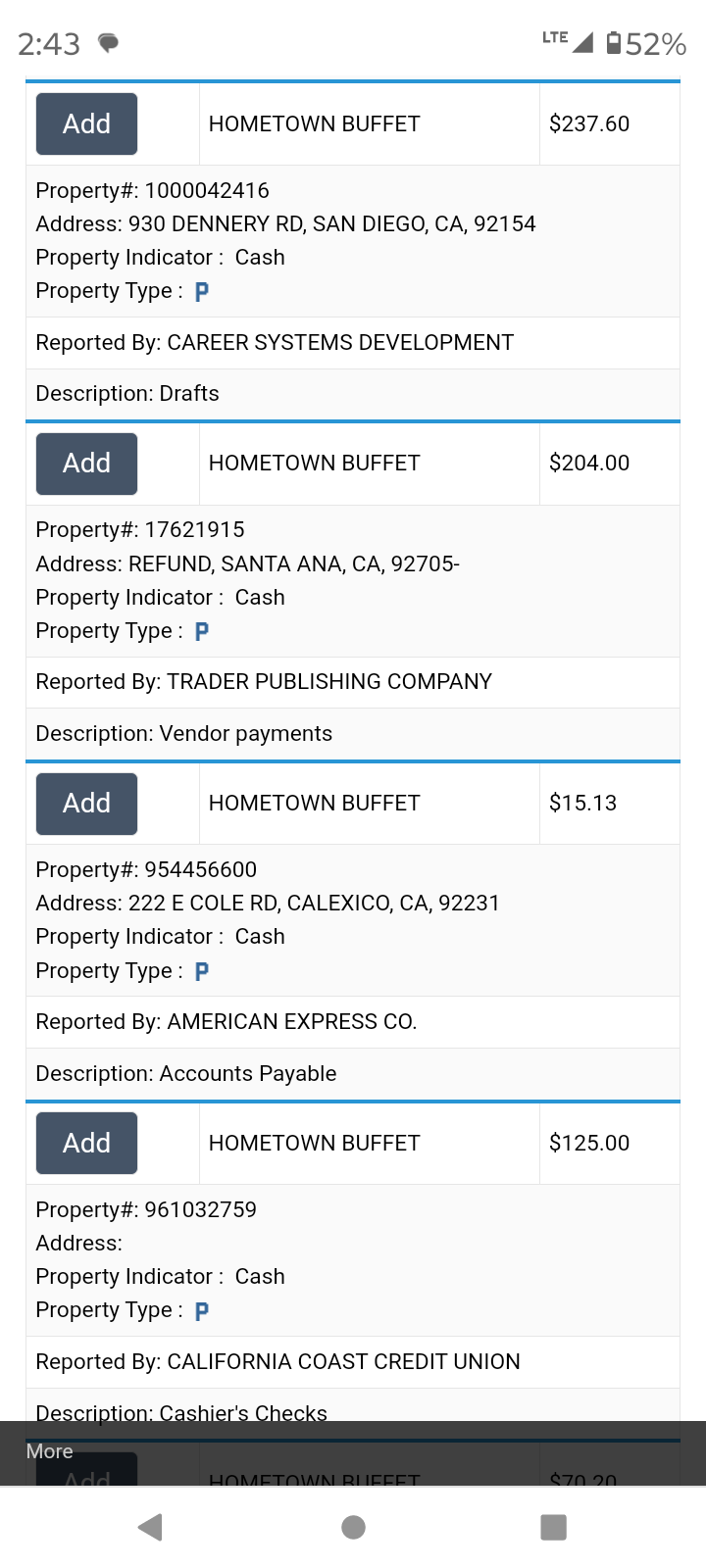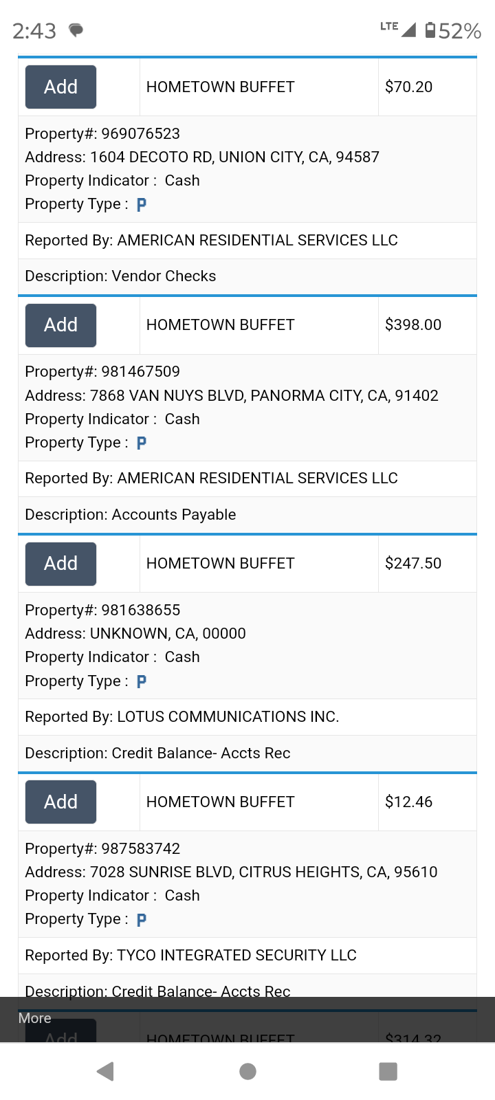 A voice says, “C. Dennis Scott, how many I help you?”. Once again, I stuttered my way through explaining that I was a big fan of Hometown Buffet, I have 6 kids who love eating there, and how I found a boatload of money in the California State Controllers Office. One account from Coca Cola Bottling Company was for $64,941!!!